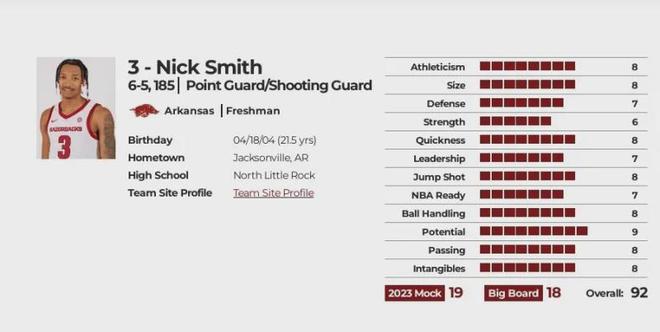 优势:一名双能卫,身高1米88,体重84公斤,拥有NBA级别的臂展和运动能力,速度极快,还有增肌潜力,他喜欢得分(大一赛季场均12.5分),而且得分手段非常丰富,尤其擅长持球突破后投篮,状态好时可以连续得分(大学17场比赛中有5场得分超过20分),被认为是一位“微波炉式”得分手,他突破防守应该不成问题;拥有良好的控球能力和快速的第一步启动速度,中距离投篮也很稳,能凭借急停跳投给防守者施加压力,在内线也能运用抛投,偶尔还凭借灵巧的技术和手感在篮下完成一些精彩上篮,他不惧远投,本赛季也展现出一些远投能力(场均三分出手超过4次,命中1.4球),既能持球进攻也能打无球,能积极切入或寻找空位投篮机会,具备成为一名高效得分后卫的所有素质。